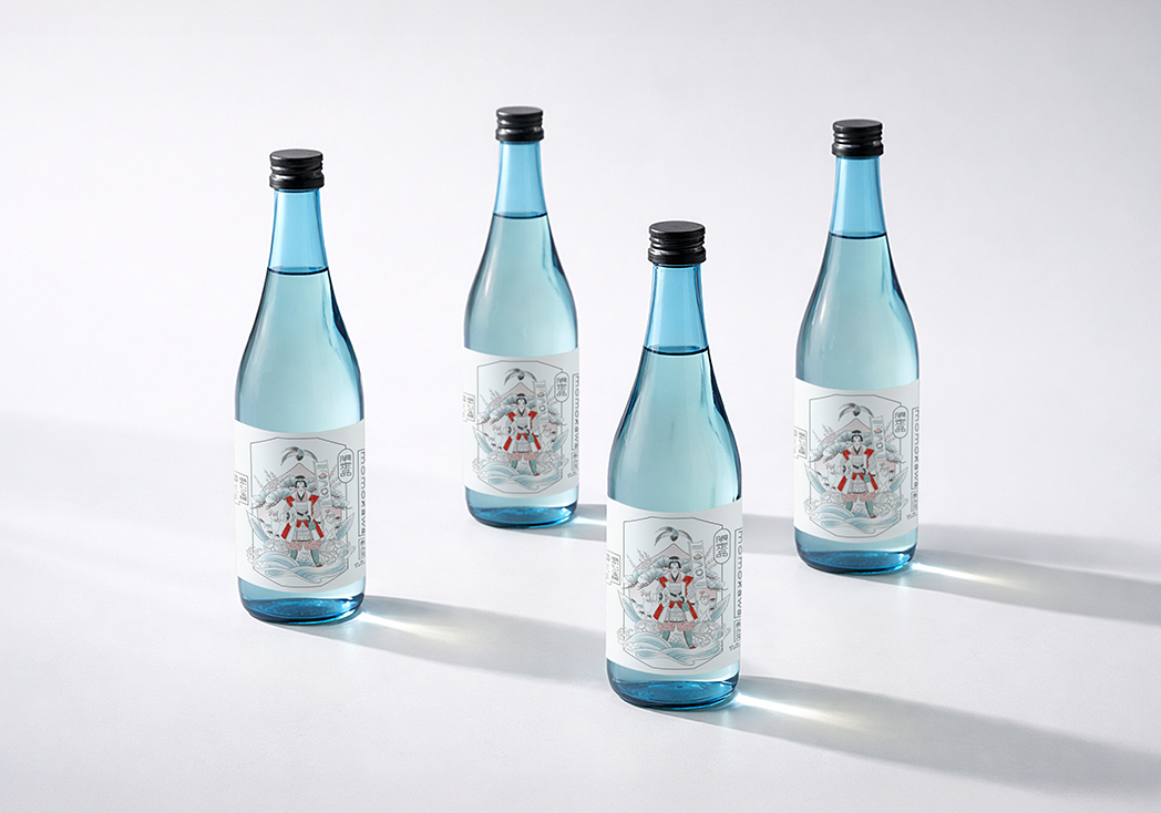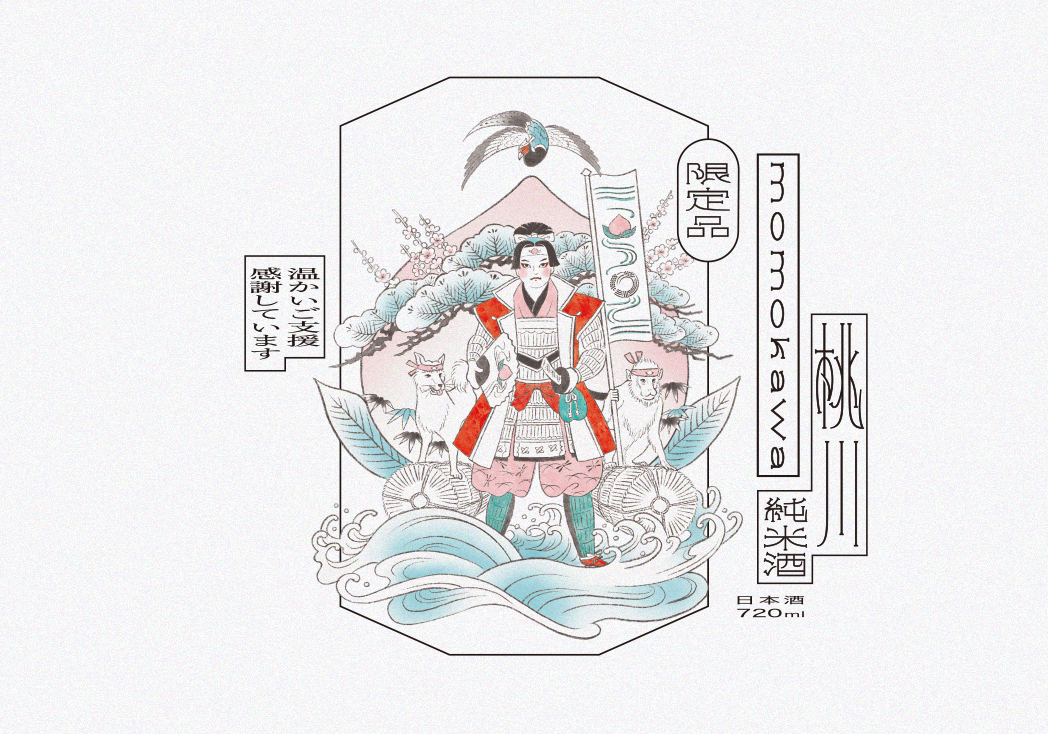 桃太郎という物語を、そのまま描けば早い。完成されたイラストは、すでに強い。だからこそ、まずは瓶との関係性を検証するところから始めました。仕上げていただいたイラストを一度分解し、要素の配置を組み替えながら、視線の流れや重心の位置を細かく調整しています。中心の意匠が、静かに立ち上がる構成へ。波や鳥といった象徴的なモチーフは、物語の強さを補強しながら、時間の奥行きを加える役割を担っています。伝統のモチーフを、いまの空気の中に置き直す。そのための再構築でした。正直に言えば、ぼくは一度、桃太郎から距離を取りたかった。あまりにも強く、あまりにも完成された記号だからです。けれどこれは、「桃川」を推してくださる方々の手元に届く一本。推しの物語に向き合う責任があると感じ、ぼく自身もあらためて桃太郎と向き合いました。 Illustration: fukaya Typography: kawakami