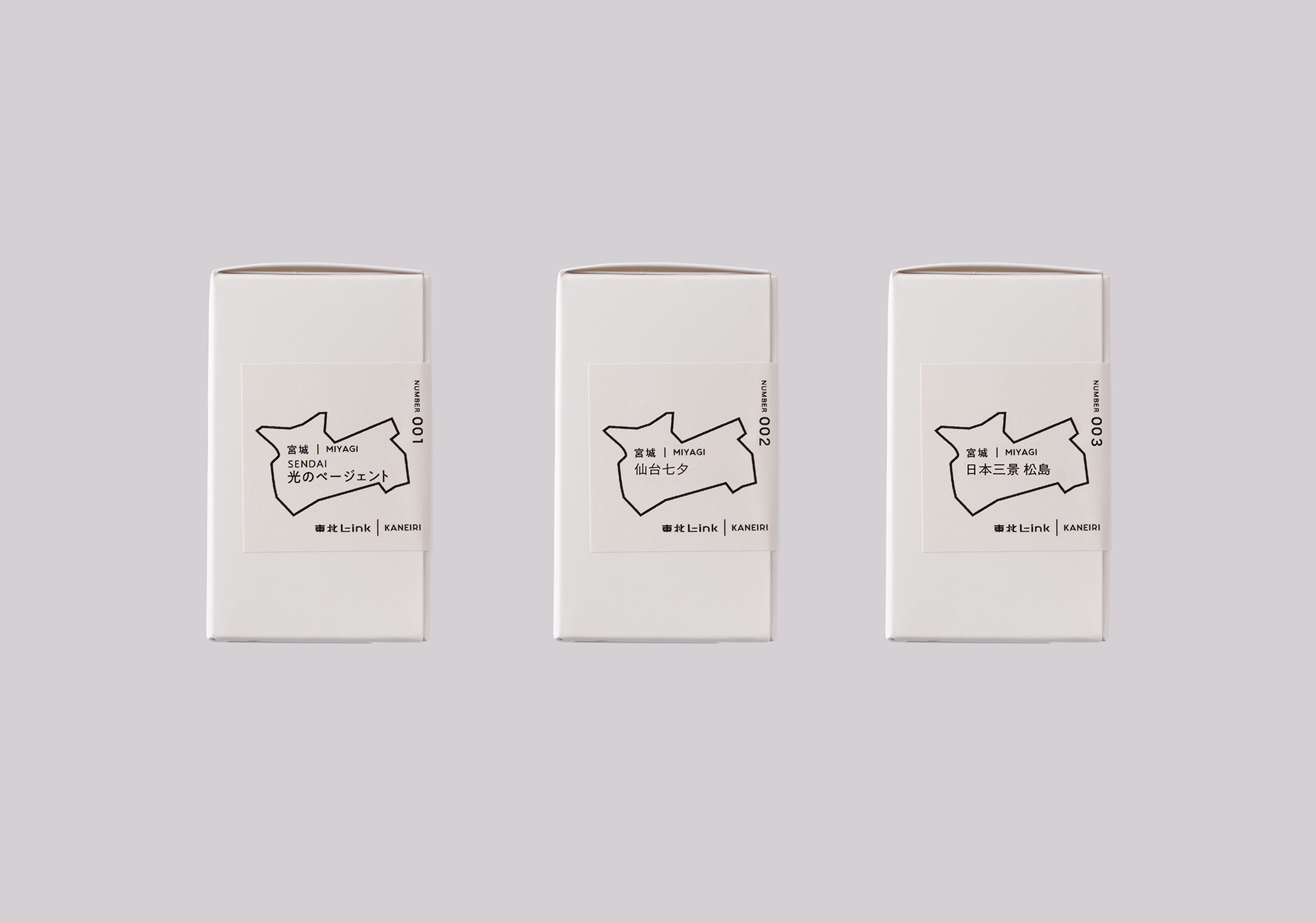 パッケージの中心となるのは、東北6県を想起させる地図の構成と、「東北」のタイポグラフです。その中に北を示す方位磁石を組み込むことで、東北という場所を指し示す象徴的なビジュアルとしました。単に地域名を記載するのではなく、かたちとして東北を感じられるように構成しています。