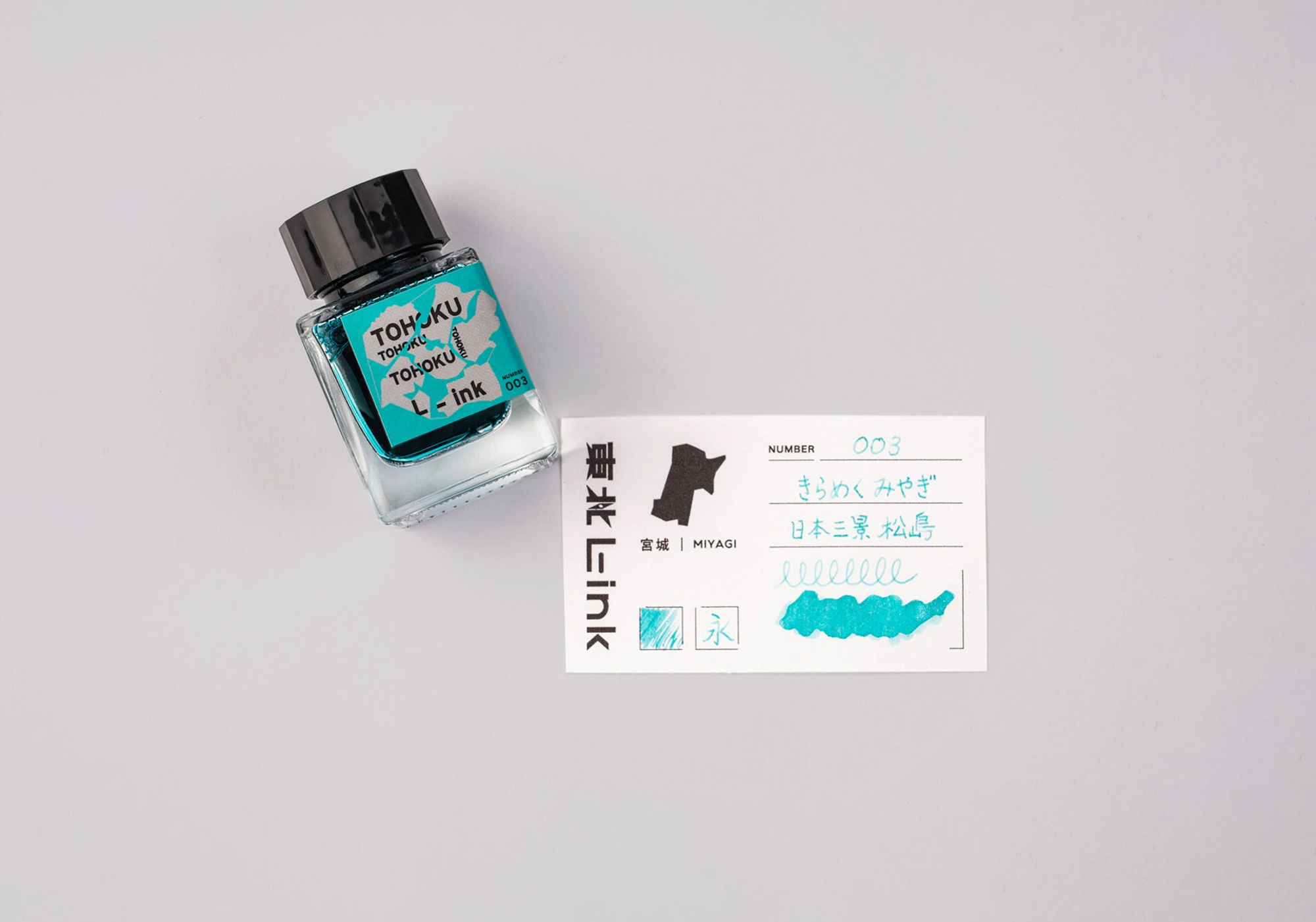 インクのパッケージは小さなプロダクトであるからこそ、情報の整理と視認性が重要になります。限られた面積の中で、シリーズとしての統一感を持たせながら、それぞれの色の個性が埋もれないよう、文字の配置や余白の取り方を細かく調整しました。タイポグラフィは情報であると同時に、パッケージ全体の印象を決めるグラフィック要素として機能しています。インクは、使う人の手の中で初めて体験になるプロダクトです。そのため、店頭で見たときの印象だけでなく、手に取ったときに静かに記憶に残る佇まいを目指しました。東北L-INKのパッケージは、地域の色や物語を過度に説明するのではなく、インクというプロダクトを通して東北という場所の気配が自然に伝わるよう設計しています。 小さな箱の中に地域の広がりをどう閉じ込めるか。東北L-INKはインクのパッケージを通して、東北という輪郭を静かに可視化するグラフィックプロジェクトです。